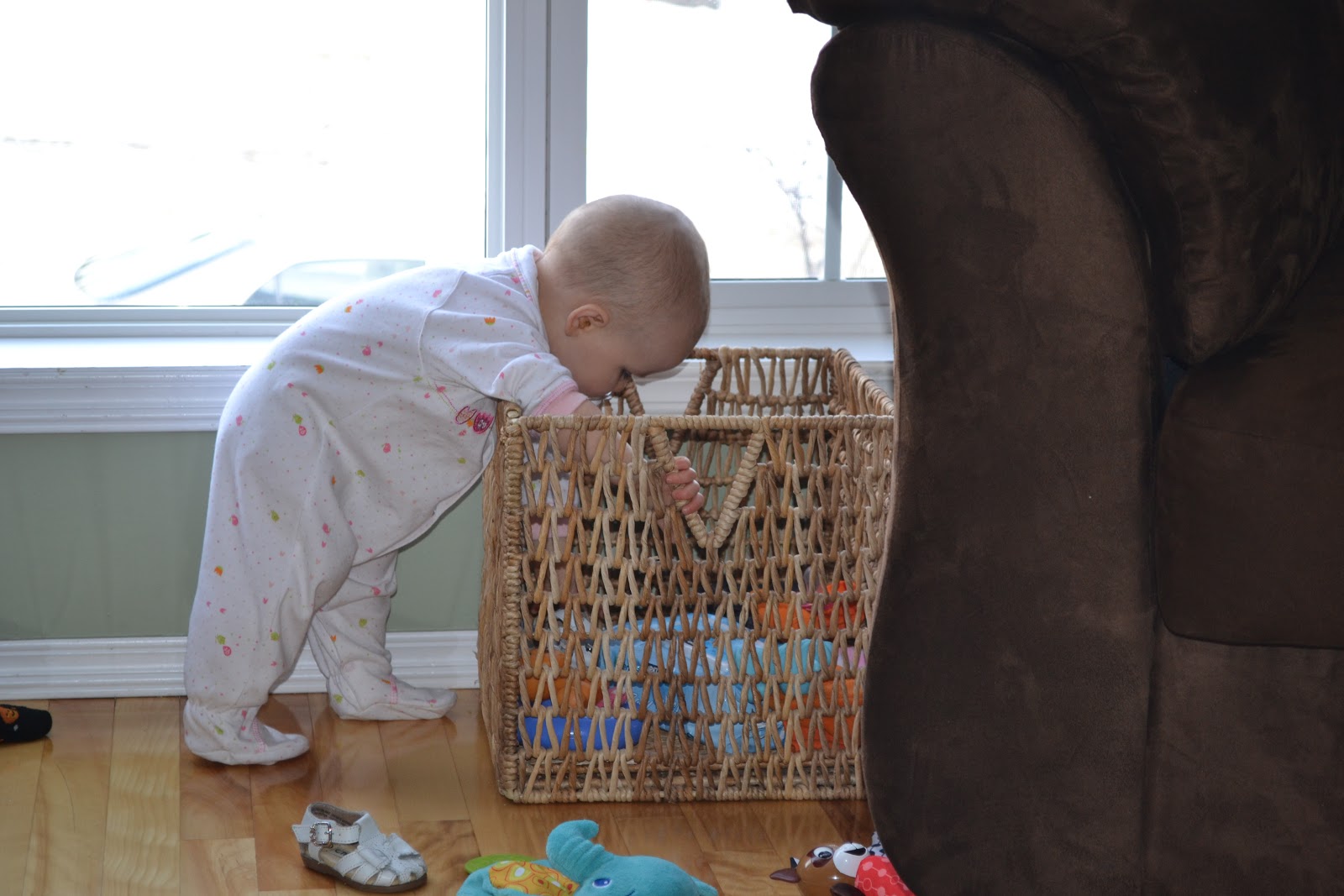 Samantha loves to pull things out but isn't too keen to put them back in. Our house is covered with toys because I can't keep up. Typical of most households, I'm sure! She also finds toys out of really random things. She loves hangers, her tylenol bottle (it has a soft syringe thing on the top that she likes chewing when she's teething), pushing her high chair everywhere, sucking on her socks/shoes, paper (man does she love the crinkling of paper. I'm not sure how much paper she has ingested, but she's definitely had some!), and ANY kind of (safe) kitchen utensil/container, etc.